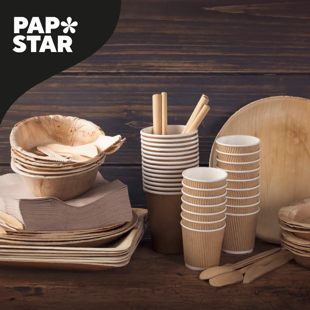 • Biologisch abbaubare Materialien: Einweggeschirr aus biologisch abbaubaren Materialien wie Bagasse, einem Nebenprodukt der Zuckerrohrverarbeitung, oder Palmblatt, das aus natürlich herabgefallenen Blättern gewonnen wird, bietet eine nachhaltige Alternative zu Plastik. Diese Materialien sind robust, hitzebeständig und zersetzen sich vollständig in der Umwelt.