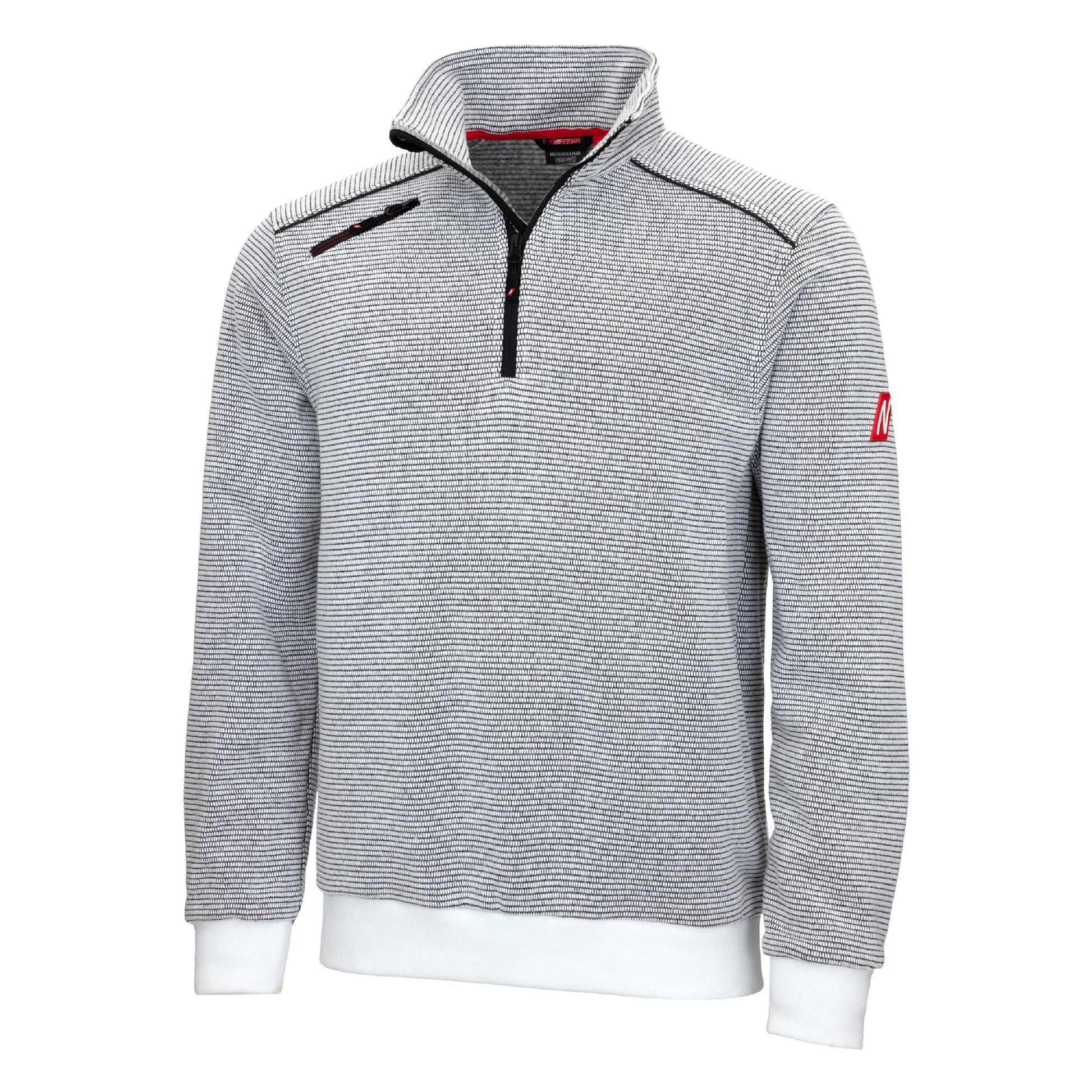 Erleben Sie den NITRAS MOTION TEX PLUS Pullover in elegantem Weiß, der mit einer Stoffdichte von 400 g/qm für hervorragende Wärmeisolierung sorgt. Dank seiner atmungsaktiven und besonders weichen Innenseite bietet er angenehmen Tragekomfort. Der Pullover ist mit einem Strickbund an Ärmeln und Taille ausgestattet, was einen optimalen Sitz garantiert. Der weiche Stehkragen und der farblich abgestimmte YKK-Reißverschluss bis zur Brust mit Kinnschutz und Windstopper innen sorgen für zusätzlichen Schutz. Reflexelemente verbessern die Sichtbarkeit und die praktische Schultertasche bietet zusätzlichen Stauraum. Zertifiziert nach OEKO-TEX STANDARD 100® und in Regular Fit erhältlich, ist dieser Pullover die perfekte Wahl für Arbeit und Freizeit.